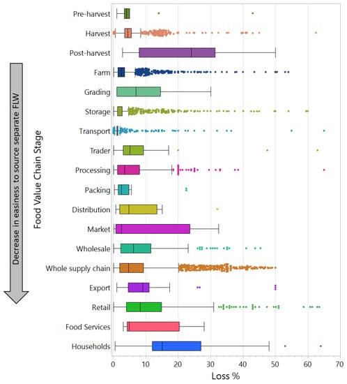 The FLW is obtained in plastic bags, packaging cartons, cans, etc. that needs to be removed to access the food waste for further processing [114]. The sorting of food waste at the production site can help in time and energy reduction required to segregate the food waste because as the FLW moves up the food value chain, the ease of separating different components reduces, while the probability of its deterioration by physical, chemical and biological factors increases. Figure 5 shows the loss percentage of FLW across different food value chain stages and decreasing easiness for waste separation complexity from source as it moves from pre-harvest to the whole sale supply chain. As the difficulty of separating the waste increases, the cost of obtaining reducing sugars will also increase. It is because of this reason that food waste from the landfill sites is preferred for anaerobic digestion or steam generation.