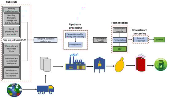 The FLW in the primary production step includes the production, pre-slaughter, harvesting, post-harvesting and post-slaughter items, the qualitative, and quantitative characteristics of which are unsuitable for sale as human food/animal feed or donation [42,43]. The FAO estimates that 30–40% of total production can be lost before it reaches the market [22,44]. Around 20% of the fruits and vegetables produced in North America are lost at the farm level [45]. A study conducted in California USA found that 57% of watermelon, 52% of cabbage, 44% of strawberries, 39% of kale and 13% of romaine hearts were lost during harvest [46]. In Nordic countries, 26% of the carrot crop and 15% of the onion crop was edible but unutilized [47]. The amount of FLW from vegetables, meat production, and tillage toward primary FLW in Ireland was 1.23, 0.41 and 0.13 million metric tons (MMT), respectively, with pests, disease, injuries, and production stress; un-harvestable; and un-saleable contributing 37%, 24%, and 21%, respectively, toward the total primary FLW tonnage [48]. Overall, 49% of cattle, 47% of sheep and lamb, 44% of pigs, and 37% of broilers live weight is considered non-edible [49]. While transporting the primary produce, 14% of the world’s food is lost [23]. The developing, and the underdeveloped countries are affected most with this where due to premature harvesting, an absence of adequate storage, poor infrastructure, inadequate marketing, and inadequate storage facilities, the primary product is rendered unfit for human consumption or to be used as animal feed [50]. In Karokh, Afghanistan, 50% of the tomatoes produced were lost due to rough shipping and handling during transportation [41]. The dairy products, meats, and fish products are more sensitive to deterioration compared to agricultural products and need to be kept in a chilled or frozen state along the entire supply chain to prevent pathogen growth and product spoilage [51]. Around 55 MMT of milk is lost before it reaches the shelf for sale, and an annual fish loss by spoilage is estimated to be 10–12 MMT [52,53]. Once at the manufacturing and processing site, the primary produce is processed and prepared for end consumers. However, around 4.81 MMT of FLW was estimated to be generated at the manufacturing sites in 2016 with 93% of the food processing FLW being recycled for use as animal feed or composting, resulting in overall energy and economic loss [54]. The manufacturing and processing sites use a good amount of water for processing and thus generate a liquid phase FLW stream viz. whey from cheese, yogurt, and tofu production, bakery effluent from equipment washing, brewery effluent, oil mill effluent, soda industry effluent potato processing wastewater, and apple pomace sludge, in addition to the solid phase waste viz. tomato waste, apple pomace, inedible dough, waste bread, potato waste, soybean curd residue and grape pomace from wineries [34,55]. The dairy products and fruit processing, respectively, required 9000–18000 and 32,000 L/metric3 during processing [34,56]. Similarly, a tofu manufacturing facility generates around 0.25 kg of tofu curd residue from one kg of soybeans rich in nitrogen but low in carbohydrates [57]. The liquid FLW stream from the beverage industry has approximately 10–12% (w/v) sugar content, and such a high sugar content can be directly used for inoculum preparation or directly for bioethanol production. [58]. The liquid FLW is also rich in nutrients and can be used for bioethanol production in a similar fashion as the solid FLW stream. A yearly consumption of 45 MMT tons of oranges generates 45–60% of the total fruits as waste [59]; tomato processing generates 40% (w/w of total tomatoes) comprising seeds (33%), skin (27%), and pulp (40%) [34], and the processing of 675.85 MMT of the paddy produced globally generated 136, 45.36, 40.8, 27.2 and 6.4 MMT, respectively, of rice husk, rice bran, broken, unripe and discolored rice [60].