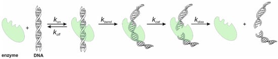- Jeltsch, A.; Pingoud, A. Kinetic Characterization of Linear Diffusion of the Restriction Endonuclease EcoRV on DNA. Biochemistry 1998, 37, 2160–2169. [Google Scholar] [CrossRef] [PubMed]