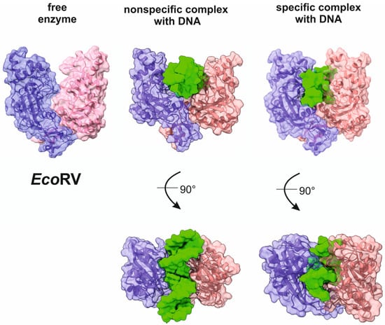 - Perona, J.J.; Martin, A.M. Conformational Transitions and Structural Deformability of EcoRV Endonuclease Revealed by Crystallographic Analysis. J. Mol. Biol. 1997, 273, 207–225. [Google Scholar] [CrossRef] [PubMed]