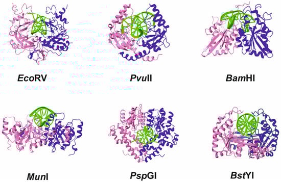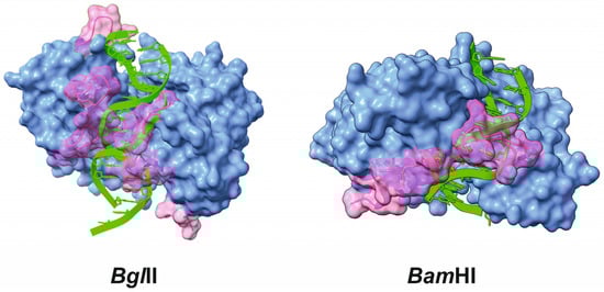 - Lukacs, C.M.; Kucera, R.; Schildkraut, I.; Aggarwal, A.K. Understanding the Immutability of Restriction Enzymes: Crystal Structure of Bg/II and Its DNA Substrate at 1.5 Å Resolution. Nat. Struct. Biol. 2000, 7, 134–140. [Google Scholar] [CrossRef]