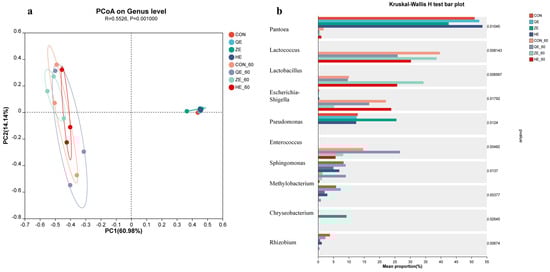Bacteria community principal coordinates analysis (PCoA) on genus level. (a) Comparison of microbial variations using the Kruskal–Wallis H test (b) for raw alfalfa and alfalfa silage. CON, fresh material of alfalfa without salt stress; QE, alfalfa under light salt stress; ZE, alfalfa under moderate salt stress; HE, alfalfa under severe salt stress; 60, 60 days of ensiling.