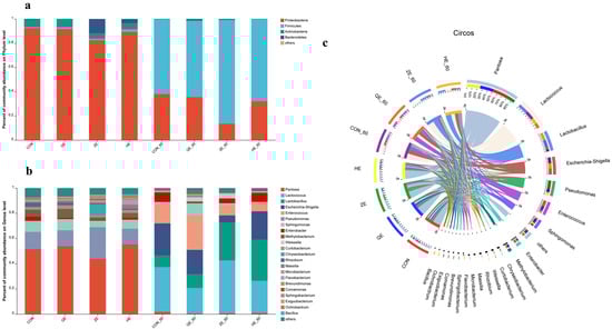 To further understand the dynamics of bacterial community succession in alfalfa silage under salt stress, bacterial communities at the phylum and genus levels were assessed (Figure 2). The bacterial communities of fresh alfalfa and ensiled feed were primarily composed of four phyla (Figure 2a). Before ensiling, Proteobacteria had the highest abundance, followed by Actinobacteria, Bacteroidetes, and Firmicutes. After ensiling, Firmicutes became the dominant phylum. Compared to other treatment groups, Firmicutes had a higher abundance in the ZE-60-treated silage. At the genus level, the predominant genera in the pre-ensiling treatments were Pantoea, Pseudomonas, and Sphingomonas. In the ZE treatment, Chryseobacterium and Pseudomonas had higher relative abundances compared to other treatment groups, while Pantoea had a lower relative abundance. After 60 days of ensiling, the dominant genera in all treatment groups were Lactococcus, Lactobacillus, Escherichia-Shigella, and Enterococcus (Figure 2b). Escherichia-Shigella and Enterococcus were dominant in the CON-60 and QE-60 treated silage. Lactococcus and Lactobacillus became dominant in the ZE-60 and HE-60 treatments, respectively. The lowest concentrations of Escherichia-Shigella and Enterococcus were observed in the ZE-60-treated silage.