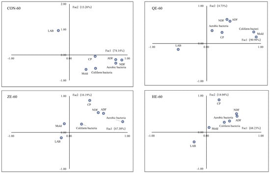 The main nutrients and microbial first-factor and second-factor loadings during the ensiling process of alfalfa on different saline-alkali soils are shown in Figure 3. During the ensiling process, a negative correlation was observed between general aerobic bacteria, molds, Escherichia coli, and CP, WSC, ADF, and NDF in the CON-60, QE-60, ZE-60, and HE-60 treatments. In contrast, a positive correlation was observed between LAB and CP, WSC, ADF, and NDF. In the ZE-60 treatment, a positive correlation was observed between general aerobic bacteria, Escherichia coli, CP, WSC, ADF, and NDF, while a negative correlation was found with molds. Based on the correlation analysis between the main nutrients and microorganisms during the ensiling process of alfalfa on saline-alkali soils, a higher quantity of LAB indicates better nutritional quality, while higher quantities of Escherichia coli, molds, and general aerobic bacteria are detrimental to the nutrient preservation of Medicago sativa in the ensiling process. In the ZE-60 treatment, molds showed a negative correlation with the main nutrients. From the above analysis, it can be concluded that LAB are the key factors influencing the nutritional quality of Medicago sativa during the ensiling process in different saline-alkali soil conditions.