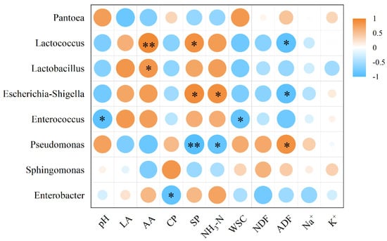 pH and WSC were significantly negatively correlated with Enterococcus (p < 0.01) (Figure 4). AA showed a significant positive correlation with Lactobacillus (p < 0.01) and a highly significant positive correlation with Lactococcus (p < 0.001). CP was significantly negatively correlated with Enterobacter (p < 0.01). SP showed a significant positive correlation with Lactococcus and Lactobacillus (p < 0.01), but a highly significant negative correlation with Pseudomonas (p < 0.001). NH3-N was significantly negatively correlated with Escherichia-Shigella (p < 0.01) and highly negatively correlated with Pseudomonas (p < 0.001). ADF showed a significant negative correlation with Lactococcus and Escherichia-Shigella (p < 0.01) and a significant positive correlation with Pseudomonas (p < 0.01).