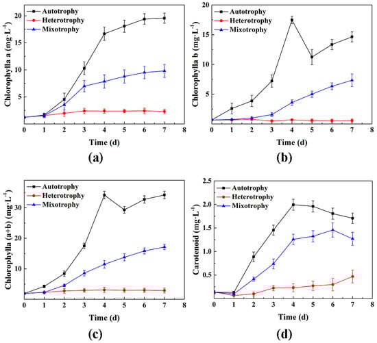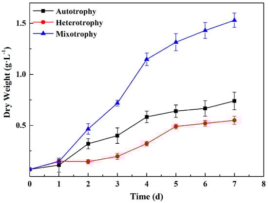 - Yun, H.S.; Kim, Y.S.; Yoon, H.S. Effect of different cultivation modes (photoautotrophic, mixotrophic, and heterotrophic) on the growth of Chlorella sp. and biocompositions. Front. Bioeng. Biotechnol. 2021, 9, 774143. [Google Scholar] [CrossRef]