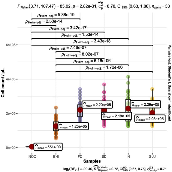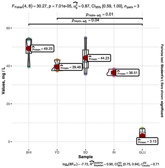 Following a fermentation period of 72 h, the increased acetic acid amount was determined to be in the range of 49.25 ± 8.35 mg L−1 for BHI, 39.48 ± 3.22 mg L−1 for FD, 44.23 ± 9.74 mg L−1 for SD, 36.51 ± 1.71 mg L−1 for IN, and 3.13 ± 3.87 mg L−1 for GLU. Graphical representation of the statistics and detailed processed data is plotted in Figure 3.