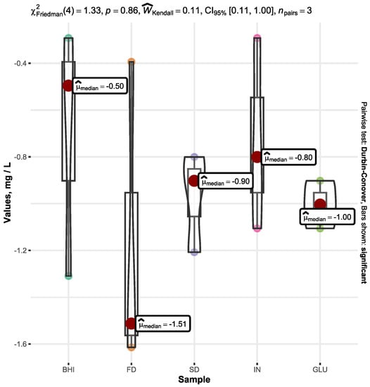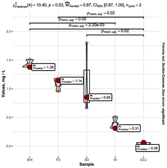 The rise in propionic acid levels within the medium, which was enriched with D-glucose (GLU), exhibited the smallest increment compared to all of the samples. This increase was notably and significantly less than that observed in the control BHI sample, whose median was determined to be 1.38 mg L−1, while the mean averaged at 1.42 ± 0.08 mg L−1. The increase in propionic acid in the FD and SD samples averaged at 1.09 ± 0.12 mg L−1 and 1.11 ± 0.61 mg L−1, respectively.