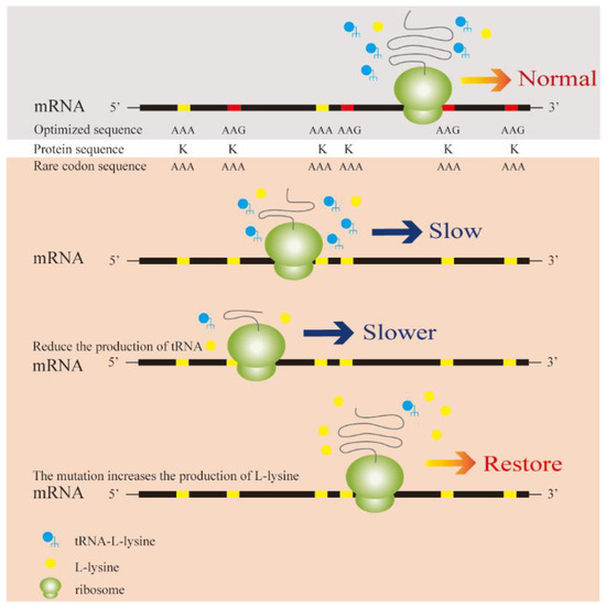 Strategies have recently been proposed for the screening of high-yielding amino-acid-producing bacterial strains using genes rich in rare codons. Owing to degeneracy, different codons can encode the same amino acid, and the decoding rate of synonymous codons varies widely, depending mainly on the abundance of homologous tRNAs [9,10]. Common codons are recognized by rich tRNAs and are translated more efficiently than rare codons, particularly at low amino acid concentrations. However, the transport efficiency of rare transcripts is close to zero, while that of ordinary tRNA remains high for only a few minutes [11,12]. Thus, instead of “codon optimization”, we can replace synonymous common codons with rare codons and knock out a proportion of the corresponding tRNAs to reduce the expression of alloproteins in the host. Additionally, if genes with rare codons can be expressed normally, the corresponding amino acid content can be maintained at a high level, and these strains are likely to be high-amino-acid-yielding strains (Figure 1) [13].