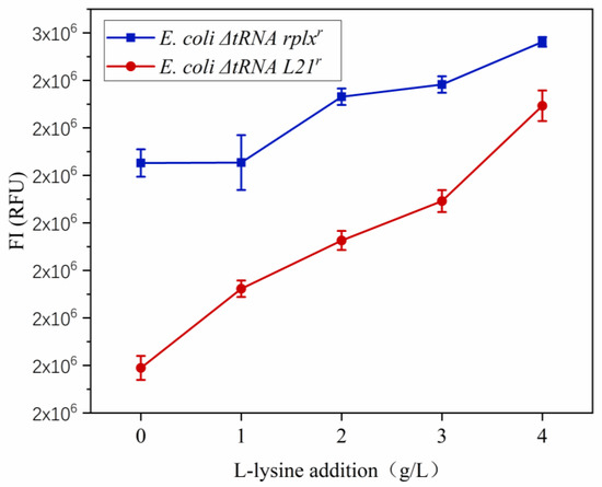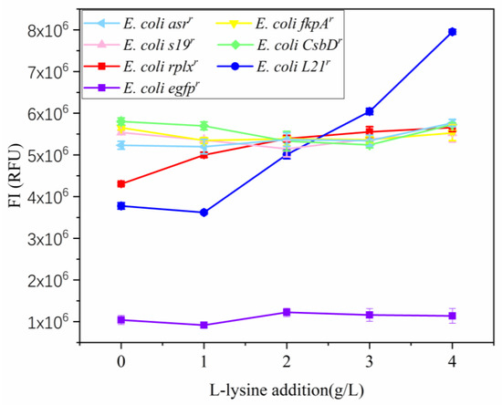 The recombinant strains E. coli asrr, E. coli fkpAr, E. coli s19r, E. coli CsbDr, E. coli rplxr, E. coli L21r, E. coli ΔtRNA rplxr, and E. coli ΔtRNA L21r were cultured for 12 h in LB medium. The activated bacterial suspensions were inoculated into 250 mL conical bottles containing 50 mL of CgXII medium supplemented with ampicillin at a final concentration of 100 μg/mL and were cultured at 37 °C rotating at 200 r/min until reaching an OD600 of approximately 1.0. The suspensions were then collected in 50 mL centrifuge tubes and centrifuged twice, each time discarding the supernatants. The remaining bacterial pellets were subsequently resuspended and re-inoculated into 50 mL of CgXII medium containing ampicillin at a final concentration of 100 g/mL and l-lysine hydrochloride at final concentrations of 0, 1, 2, 3, or 4 g/L; each concentration was assessed in triplicate. To induce fluorescent protein expression, IPTG was added to the suspensions to a final concentration of 0.5 μM, and the cultures were incubated at 25 °C and 200 r/min for 14 h. Following induction, fluorescence intensities were measured at excitation and detection wavelengths of 488 and 535 nm, respectively, and correlations between the expression of fluorescent proteins and the concentration of l-lysine were determined.