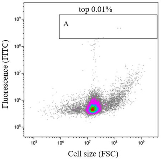 Flow cytometry analysis results. The ordinate FITC shows the fluorescence intensity of staygold-L21r. The darker the color, the more densely clustered the cells. The cells in Region A are characterized by strong fluorescence. Single cells with strong fluorescence signals were sorted and inoculated into a 96-well plate containing LB medium.