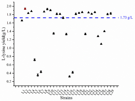Using the sorting results, we selected 29 mutant strains of E. coli L21r (Figure 6). Among the 29 mutant strains, we screened 16 with elevated l-lysine yields, representing a screening efficiency of 55.2%. The highest yielding l-lysine group among the three parallel fermentation yields of the E. coli QD01ΔtRNA strain (1.73 g/L) was E. coli QD01ΔtRNA L2 (Figure 6).
