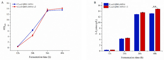OD600 values and l-lysine production of E. coli QD01ΔtRNA L2 and E. coli QD01ΔtRNA (fermentation medium). (A) The OD600 of E. coli QD01ΔtRNA was lower than that of E. coli QD01ΔtRNA L2, which showed a 4.5% increase in OD600. (B) After fermentation for 48 h, the l-lysine yield of the wild-type strain E. coli QD01ΔtRNA was 13.2 g/L, whereas that of the engineered mutant E. coli QD01ΔtRNA L2 was 14.8 g/L, which represents an increase of 12.1% (** p > 0.05).