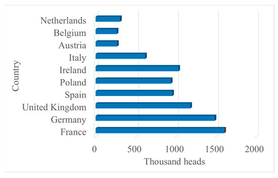 Cattle distribution worldwide is not uniform, but concentrated in certain locations. For example, in Europe, Germany, France, and the United Kingdom are the countries with more heads of cattle, as seen in Figure 1.