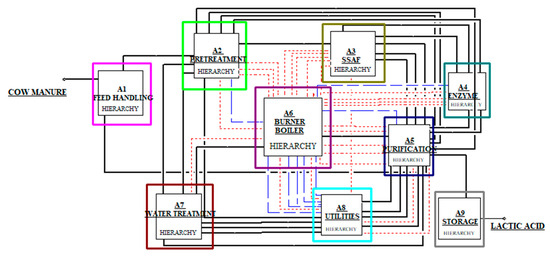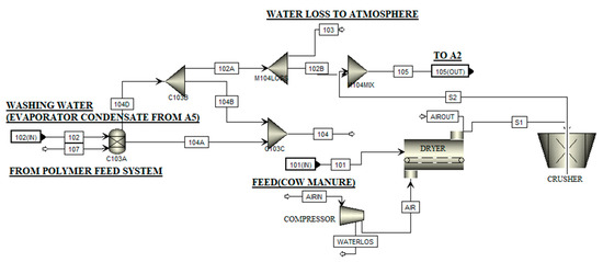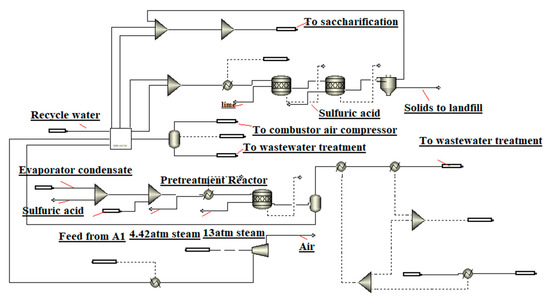 - In area A2, the dry dilute acid pretreatment method was applied with 8% of cow manure solids and 33% of dilute sulfuric acid solution (5% sulfuric acid in weight percentage). Solid–liquid separation using flash-cooling was required. This area included ammonia conditioning on liquid pretreatment hydrolysate, as per the NREL design.