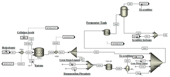 After completing the pretreatment, the solution was moved into the fermentation and saccharification stage. Only one vessel was necessary for the hydrolysis and fermentation of the hexose and pentose sugars because SSAF was used. An efficiency of 33% was expected. In a previous study [12], inhibitors were analyzed in a laboratory and no significant level of byproducts, such as furfurals, was produced during the saccharification process; therefore, they were not considered here. Figure 5 provides an overview of the SSAF section.
