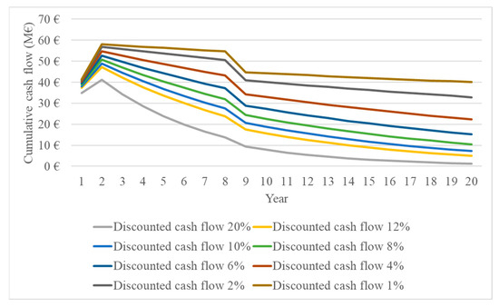 The IRR is the discount rate in cases where the NPV was zero [47] and was characterized in Equation (3):