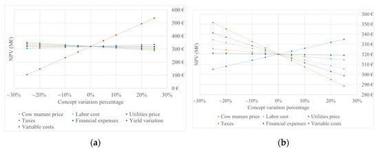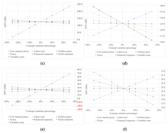 The sensitivity analysis was used to assess the effects of various factors on the economic performance. A number of variables were individually assessed and set at 50% variance at the beginning of the entire plant’s lifetime because the global economic situation could change throughout the course of a plant’s existence. These included the cow manure price, labor cost, utilities prices, financial expenses, taxes, variable costs, and yield. At an 8% discount rate, the NPV served as an indicator [55].