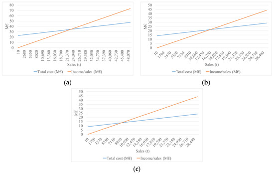 Break-even chart for sales in EUR. (a) Break-even chart for scenario I; (b) break-even chart for scenario II; (c) break-even chart for scenario III.