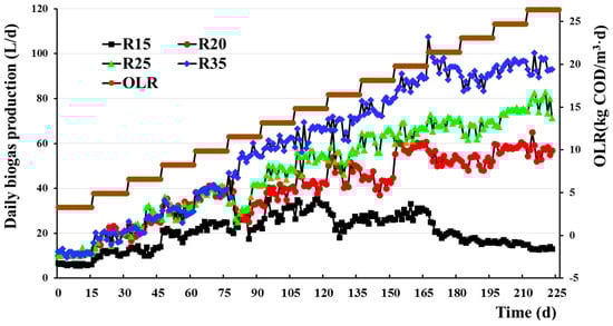 Effects of temperature and organic loading rate (OLR) on biogas production. R15, R20, R25, and R35 represent reactors set at temperatures of 15 °C, 20 °C, 25 °C, and 35 °C, respectively. The OLR in all reactors was incrementally increased from 3.3 kg (COD)/m3·d to 26.4 kg (COD)/m3·d, and each level was maintained for 15 d (5 HRTs).