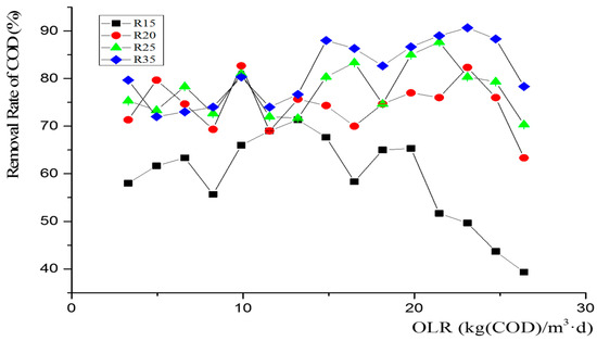 The biogas production was not significantly affected by a temperature difference of 5 °C between R20 and R25, when operating at OLRs below 11.55 kg (COD)/m3·d (p > 0.05; 95% confidence, Figure 1); however, when compared with the moderate temperature reactor R35, a decrease in biogas production of 16% was observed in both R20 and R25 with reductions of 10 °C and 15 °C, respectively (Figure 1). When the OLR exceeded 11.55 kg (COD)/m3·d, biogas production in R20 and R25 significantly differed (p < 0.01; 95% confidence) and were 38.2% and 22.4% lower than that in 35 °C, respectively (Figure 1). It could be seen that when the OLR was low, the effect of temperature on biogas production was small; when OLR increased, the temperature showed a stronger effect on biogas production. Biogas production in 15 °C decreased by 40.8% and 51.8% under low (less than 11.55 kg (COD)/m3·d) and high (exceeding 11.55 kg (COD)/m3·d) OLRs, respectively, compared with that in 20 °C. This decrease was by much more than the decrease in production in 20 °C compared with that in 25 °C (0% and 25.6% under low and high OLRs, respectively). And, a similar result can be obtained from the change in removal rate of COD following the promotion of OLR (Figure 2). Therefore, it is probable that a temperature threshold existed between 15 °C and 20 °C, below which the point microbial metabolic output is strongly restrained.