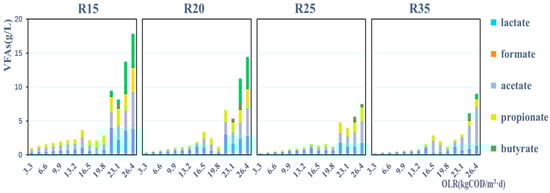Accumulation of volatile fatty acids (VFAs: lactate, formate, acetate, propionate, and butyrate) changed with promotion of OLR in R15, R20, R25, and R35, respectively.