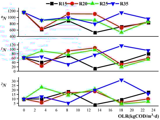 The species richness (0N) in all reactors was less than that in the seed sludge (Figure 4), and the species richness in R15 and R20 was lower than that in R25 and R35 under the initial OLR. And, this may indicate that reduction of 15–20 °C from moderate to low temperature deteriorated the richness of the bacteria community in the case that the seed sludge was from the full-scale UASB reactor at moderate temperature. In addition, the instability of 0N in R15, R20, and R25 was bigger than that in the control group R35 along with changes in the OLR according to the standard deviation of species richness (STDEV.S: R15, 153.7; R20, 228.2; R25, 170.8; and R35, 129.6). This may indicate that the reduced temperature weakened the stability of the microbial communities in the reactors.