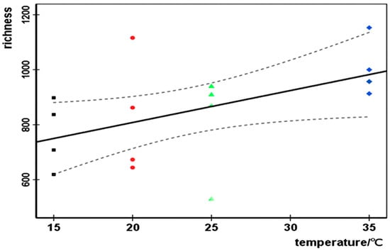 Linear regression between temperature and richness. The dotted curve represents the 95% confidence limit (r2 = 0.254; p = 0.047). The black squares, red circles, green triangle, and blue rhombus, respectively, represent 0N of R15, R20, R25, and R35 under different OLRs.