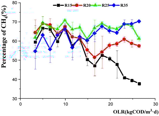 CH4 content with increasing OLR in R15, R20, R25, and R35; error bars represent the percentage of methane standard deviations of triplicate measurements.