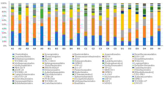 Composition of bacterial community under different OLRs at the order level in R15, R20, R25, and R35, respectively. The letters A, B, C and D represent 15 °C, 20 °C, 25 °C, and 35 °C, respectively; the numbers 1, 2, 3, 4, and 5 represent OLRs 3.30, 8.25, 13.2, 18.15, and 23.10 kg (COD)/m3·d, respectively.