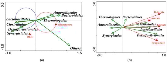 Redundancy analysis (RDA) for correlations between the main bacteria and temperature: OLR (a) and VFAs (b). In Figure 5a, the section of t-value biplot with Van Dobben circles delimits the scores of bacteria OTUs significantly correlating with temperature at p < 0.05 (Monte Carlo permutation test/reduced rank regression). Red circle encloses positively correlating species taxa with temperature, whereas the blue circle delimits the negatively correlating taxa. The redundancy analysis was conducted using Canoco 4.5 software.