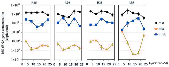 Quantitative changes in the 16S rRNA gene concentrations of the family Methanosaetaceae (Mst), the family Methanosarcina (Msc), and the order Methanomicrobiales (Mmb). Samples were from five OLR points (3.30, 8.25, 13.2, 18.15, and 23.10 kg (COD)/m3·d) in R15 (15 °C), R20 (20 °C), R25 (25 °C), and R35 (35 °C), respectively. Error bars represent the gene concentration standard deviations of triplicate measurements.