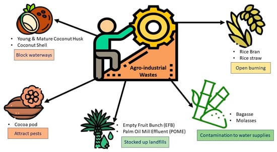 Agro-industrial waste represents a significant environmental challenge in Asia. The region produces approximately 1.3 billion tons of agro-industrial waste annually, while only a small fraction is recycled or composted. Malaysia, a prominent agricultural producer in Southeast Asia, generates substantial waste from agricultural activities [,]. Coconut husk, empty fruit bunches (EFB), rice husks and bagasse are among the most common agricultural wastes in Malaysia, as shown in Figure 1 [,,,]. This waste can pollute waterways, contaminate soil, and release harmful gases into the atmosphere. It can also pose a health risk to humans and animals.