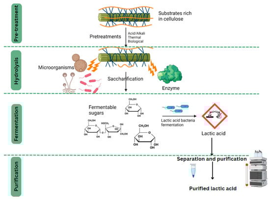 The summary of the bioconversion of sugarcane bagasse into lactic acid. The authors generated the original figure using the information sourced from [].