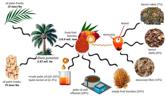 Malaysia is acknowledged as a major global producer of palm oil, and as a result, it yields a significant amount of biomass from its oil palm processing. This biomass comprises elements like EFB, oil palm fronds (OPF), oil palm trunks (OPT), palm kernel cakes (PKC), and palm oil mill effluent (POME), as outlined by Boonsawang and Youravong []. Study by Bejarano et al. [] reported that merely 23% of waste and by-products from agro-industry are recycled back into the production process, leaving the bulk of these resources untapped. A breakdown of the weight percentage of these oil palm elements is shown in Figure 4 [].