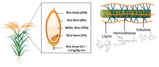 To tackle these challenges, recent studies have focused on the sustainable utilization of rice by-products within a biorefinery concept. By adopting this approach, the by-products of the rice production process can be effectively utilized, reducing waste, and promoting a more circular economy. Countries like China, India, and Indonesia, which are major rice producers, generate a significant portion of the annual rice waste, accounting for nearly half of the total amount, approximately 200 million tons []. The utilization and management of rice waste exhibit variations across different countries and regions. In some areas, rice waste finds its purpose as animal feed, contributes to energy generation, is used for biofuel production, or serves as a raw material for diverse industrial applications. Rice waste encompasses the by-products and residues generated during rice production and processing. It includes rice husk, rice straw, and rice bran (Figure 5).