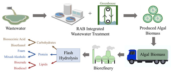 Pierson, J.; Makkena, G.R.; Kumar, S.; Kumar, V.; Vivekanand, V.; Husain, H.; Ayser, M.; Balan, V. Modeling the Production of Microalgal Biomass in Large Water Resource Recovery Facilities and Its Processing into Various Commodity Bioproducts. Fermentation 2023, 9, 909. https://doi.org/10.3390/fermentation9100909