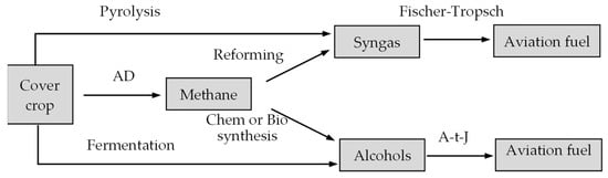 Technically, SAF can also be produced from biogas, landfill gas, syngas, or ethanol oriented from cover crops. In February 2021, NetJets, an American private jet company, announced it to invest in WasteFuel, a Los Angeles-based company that transforms landfill waste into SAF and purchase a minimum of 100 million gallons of WasteFuel’s SAF over the next ten years []. In March 2022, the U.S. Department of Energy (DOE) funded SkyNRG Americas to conduct feasibility studies and small-scale research and development to produce SAF from biogas []. In May 2023, Kenya Airways became the first African airline to use SAF produced from waste animal fats and used vegetable oils by Eni []. Possible pathways for transforming cover crops to biogas, and then to SAF are shown in Figure 1. Cleaned biogas can be converted into syngas via steam reforming, dry reforming, or partial oxidative reforming []. Then, conditioned syngas can be transformed into aviation fuel via Fischer-Tropsch synthesis. Alternatively, methanol and alcohol can be produced from methane gas via a chemical or biological process [] and then transformed to aviation fuels via the A-t-J (Alcohol-to-Jet fuel) process []. Syngas and alcohol may also be produced from cover crops via pyrolysis or fermentation respectively.