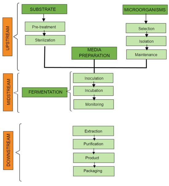 The upstream phase comprises the preparation of the substrate and the pre-treatment and sterilization processes, wherein the application of chemical, physical, biological, and combined methods have the purpose of hydrolyzing and separating the components of the lignocellulosic material to facilitate metabolism by microorganisms [,,]. In addition, the choice of the reaction medium and the microorganisms to be used depends on the chosen substrate and the type of final product required [,].