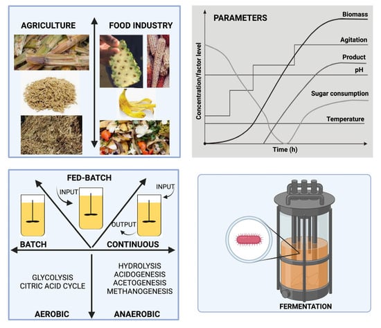 Fermentation is the process by which biomass residues are used as substrates for the metabolism of various microorganisms []. Figure 2 outlines the stages of this process and the monitoring and follow-up needed to obtain better results.