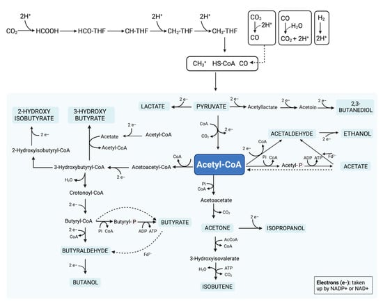 To produce a range of compounds such as acetate, ethanol, butyrate, and butanol, fermentation by microorganisms depends on acetyl coenzyme A (acetyl-CoA). The oxidation of H2 to 2H+ with H2O, or of CO with H2O to 2H+, provides the reducing equivalents for the reduction of CO2 to form methanoic acid (HCOOH), from methylene tetrahydrofolate (CH-THF) to methenyl tetrahydrofolate (CH2-THF), from CH2-THF to methyltetrahydrofolate (CH3-THF), and from CO2 to CO. Acetyl-CoA synthase/CO dehydrogenase catalyzes the formation of acetyl-CoA from methyl group bonding, CO group bonding, and coenzyme A (CoA). The metabolic pathways of acetyl-CoA reduction, which are involved in the fermentation of biomass conversion into a range of biofuel compounds, are displayed in Figure 5 [,,].