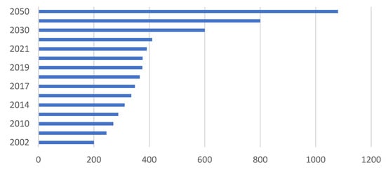 The continuous production of plastics from the petrochemical industry has generated an exorbitant amount of waste for disposal. Such waste is part of approximately 140 million tons of plastics produced in 2022, and an estimate of plastic waste in the ocean has reached a level of 150 million tons [,]. Figure 6 shows a forecast for global plastics generation from 2002 to 2050 [,].