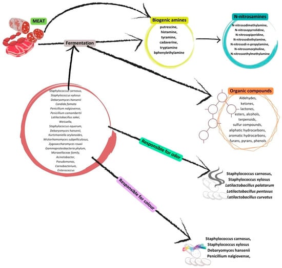 The enzymatic hydrolysis and fermentation of starting cultures produce bioactive peptides. Both meat products and the gastrointestinal system after intake contain these peptides []. In microbial activities that take place in fermented meat products, biogenic amines are produced that are important for food safety and quality. The biogenic amines putrescine, histamine, cadaverine, and tyramine, as well as tryptamine and bphenylethylamine, were found in a study on fermented sausages [,]. Although the Bifidobacterium longum species, which participates in the fermentation process and has probiotic properties as well [], inhibits the creation of cadaverine from biogenic amines, and an increase in these amine species also leads to toxicity and the formation of N-nitrosa compounds [,]. When nitrites are present, biogenic amines can be transformed into nitrosamines. Secondary amines and NO can combine to generate far more durable carcinogenic nitrosamines than primary amines. Salami samples contain N-Nitrosodimethylamine, N-Nitrosopyrrolidine, N-Nitrosodipropylamine, and N-Nitrosomethylethylamine kinds []. N-nitrosoethylmethylamine, N-nitrosodimethylamine, N-nitrosopiperidine, N-nitrosopyrrolidine, N-nitrosodiethylamine, N-nitrosodi-n-propylamine, and N-nitrosomorpholine are the principal nitrosamines found within the majority of products of fermented meat [,]. Figure 1 shows the changes throughout the meat fermentation.