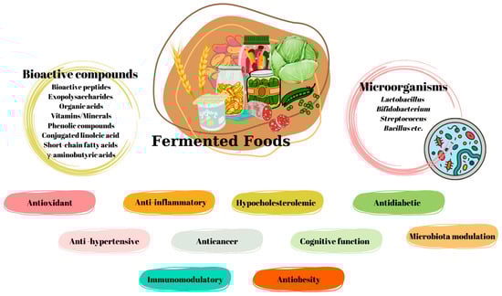 Food fermentation’s main purposes are to increase food safety and lengthen shelf life; additionally, fermented foods have grown to be known for their positive effects on health []. Foods that have undergone fermentation may produce bioactive compounds as byproducts of the process, and fermented foods may contain live microorganisms that have health benefits []. The main metabolites and microorganisms involved in food fermentation may be divided into categories: alcohol, carbon dioxide (from yeast), propionic acid (from Propionibacterium freudenreichii), lactic acid (from lactic acid bacteria (LAB) from genera such as Lactobacillus and Streptococcus), acetic acid (from Acetobacter), ammonia, and fatty acids (from Bacillus and molds) []. The metabolites produced by the fermenting organisms limit the expansion of spoilage, and pathogenic organisms during food fermentation extend the shelf life of perishable foods []. During fermentation, macronutrients are broken down, and digestion is facilitated. Many fermented foods include probiotic-potential bacteria in them []. Probiotics are defined in the FAO/WHO report as “Live microorganisms which when administered in adequate amounts confer a health benefit on the host” []. According to the ISAPP, these concentrations of probiotics can vary daily from 100 million to over a trillion CFU. The majority have been studied at concentrations of 1 to 10 billion CFU/d []. Fermented foods may serve as probiotic carriers, effectively delivering the probiotic to the host and conferring health advantages []. Although there may be a fermentation process involved, consumed fermented foods may not contain live bacteria. The term “probiotic” is only used when a product has clearly shown health advantages brought about by the action of well-defined and characterized living microorganisms []. The metabolic activity of microorganisms during fermentation results in a number of biochemical alterations that have impacts on the nutritive and bioactive qualities of fermented foods. The bioactive components showing health benefits include exopolysaccharides, bioactive peptides, phenolic compounds, short-chain fatty acids (SCFAs), conjugated linoleic acid (CLA), and γ-aminobutyric acids (GABAs) []. Fermented foods and their components can have many health effects such as antioxidant, antidiabetes, anti-inflammatory, anti-hypercholesterolemic, and microbiota modulation effects [,,,].