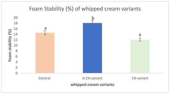 Foam stability (%) of whipped cream variants. a,b values followed by different superscripts are significantly different (p < 0.05).
