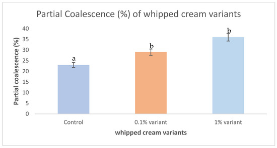 Effect of WPH-MD probiotic encapsulant on the partial coalescence of whipped cream variants. a,b values followed by different superscripts are significantly different (p < 0.05).
