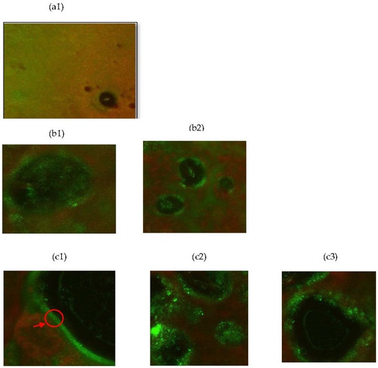Confocal laser scanning micro-images of whipped cream variants at 60× magnification. (a1): control whipped cream with no WPH-MD encapsulant; (b1,b2): whipped cream with 0.1% WPH-MD probiotic encapsulant; (c1,c2,c3): whipped cream with 1% WPH-MD probiotic encapsulant. Black holes represent the air cells entrapped during whipping process. Red zone indicates the fat presence stained with NR dye and green zone indicates the whey proteins stained with FITC dye. Red arrow indicates the adsorbed WPH-MD layer at the interface surface of whipped cream.