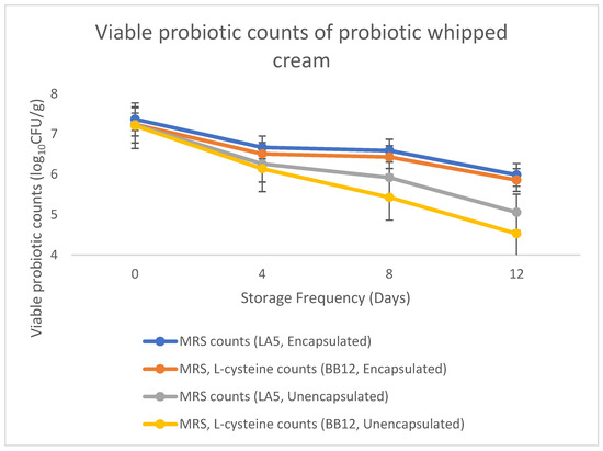 As shown in Figure 4, whipped cream with encapsulated probiotics (LA5 and BB12) did not show a substantial decrease in their viability during storage. On the 12th day, the probiotic organisms (LA5 and BB12) retained approximately 6 logs CFU/g. On the other hand, control with unencapsulated probiotics showed a significant difference in the probiotic’s viability (LA5 and BB12) at 0-, 4-, 8- and 12-day storage days. The probiotic counts dropped to approximately 5 logs CFU/g by the end of the storage time. The results demonstrated that the encapsulation protected the probiotics, LA5 and BB12, by retaining their viable cells during the storage.