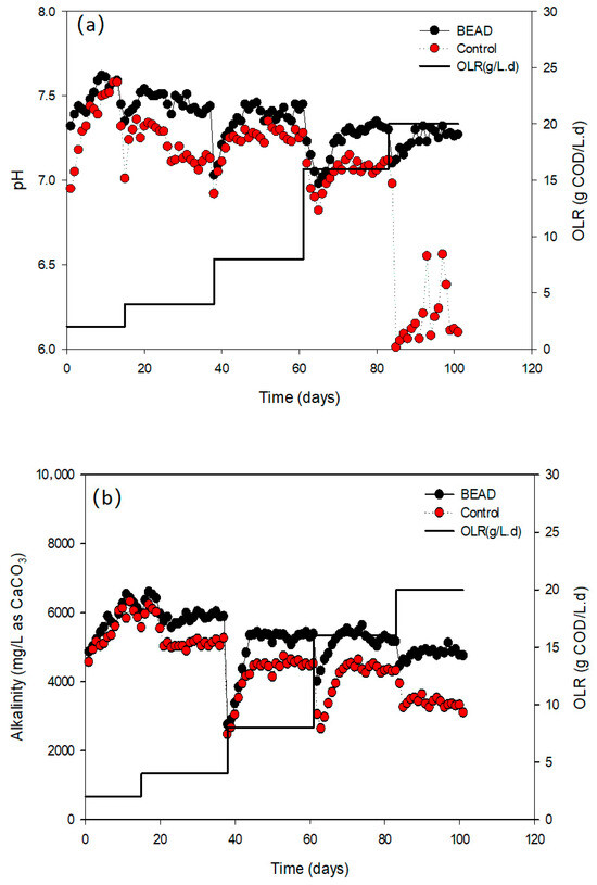 3.1. State Variables (pH, Alkalinity, and VFA) under Different OLRs