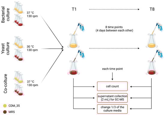 Schematic representation of yeast and bacteria co-cultures. The scheme represents the experimental setup of the single and co-cultures of bacteria and yeast both in the rich medium (MRS) and in the chemically defined medium (CDM35). During each time point (4 days between each one, from T1 to T8), cell growth was evaluated using the Burker chamber, and 2 mL of supernatant was collected for GC-MS analyses.